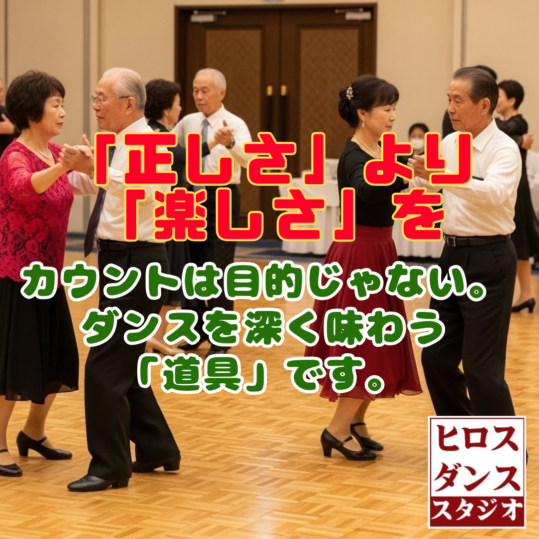 私たちが「カウントやアクセントを気にしすぎるべきではない」と考えるのは、社交ダンスが「技術のためのダンス」「正しく踊るためのダンス」になってしまうことを避け、「楽しさ」を常に中心に置いてほしいと願っているからです。