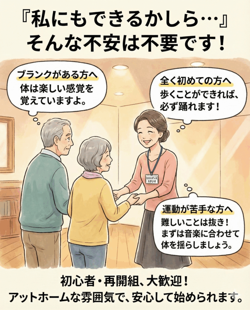 ヒロスダンススタジオは、社交ダンスを通じて人々が幸せで、身体と頭、こころも健康な生活を送れることを目指しています。社交ダンスの普及に努め、より多くの人々が穏やかな気持ちで過ごせるように活動していきます。