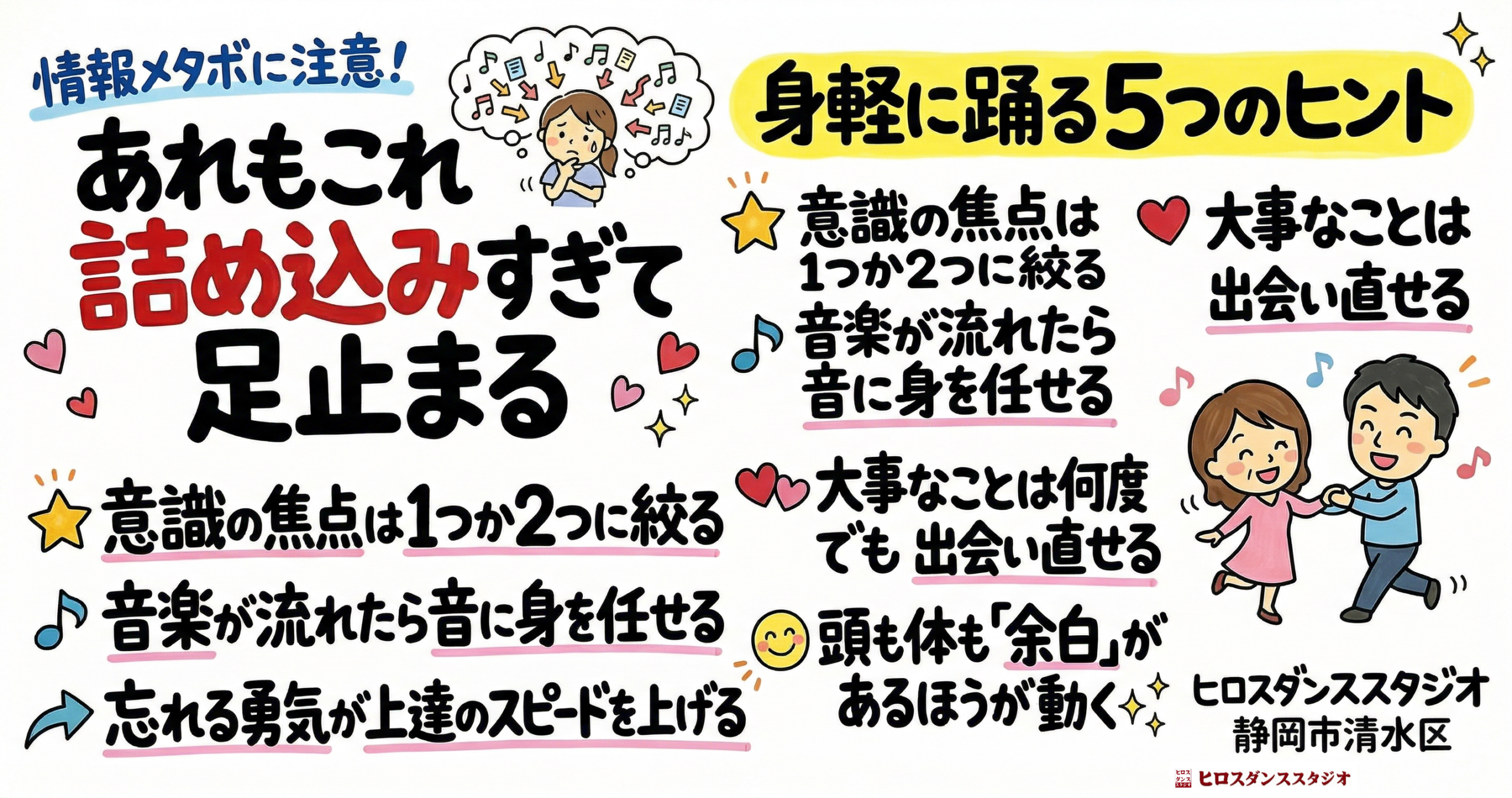 静岡市清水区のヒロスダンススタジオが、社交ダンスの練習で「考えすぎ」を手放すコツをお伝えします。意識をひとつに絞り、頭と体を柔らかくして音楽に乗る楽しさを味わいましょう。初心者の方から上級者の方まで役立つ、のびのびと踊るための秘訣です。