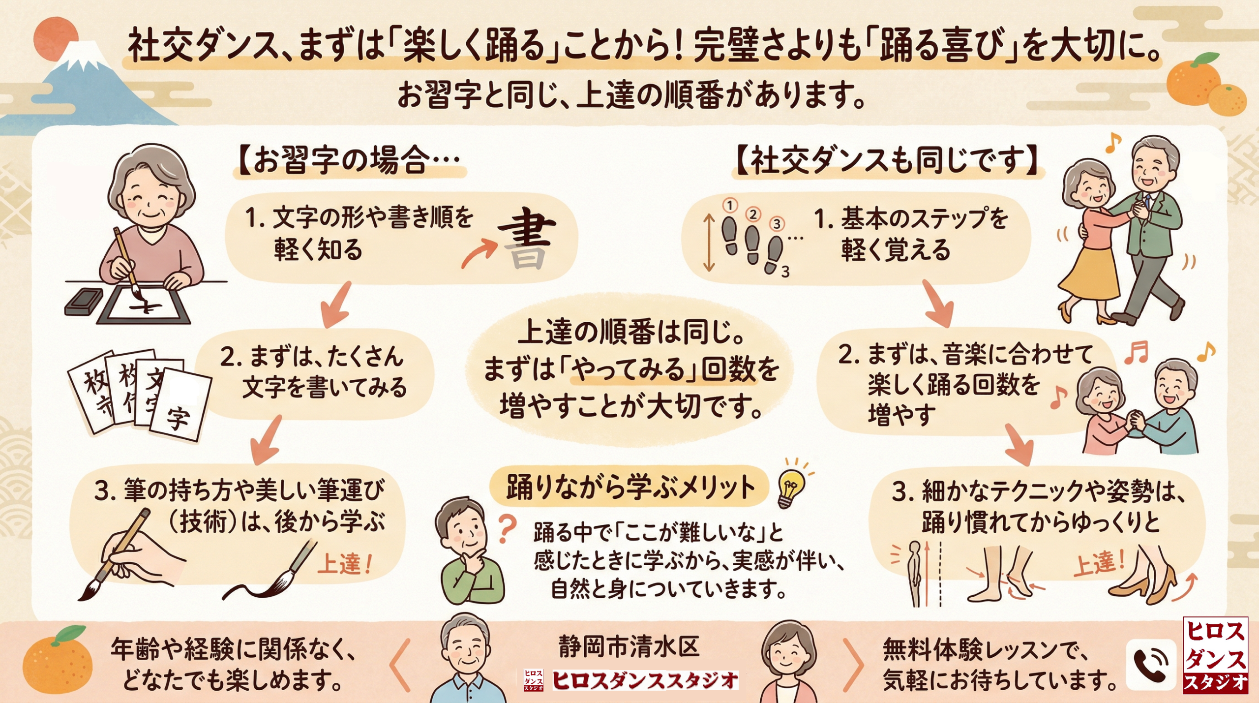 静岡市清水区のヒロスダンススタジオです。社交ダンス初心者は基礎より「軽く踊る」楽しさが大切です。60代70代からでも安心して始められるレッスンの進め方をご紹介します。無料体験も受付中です。